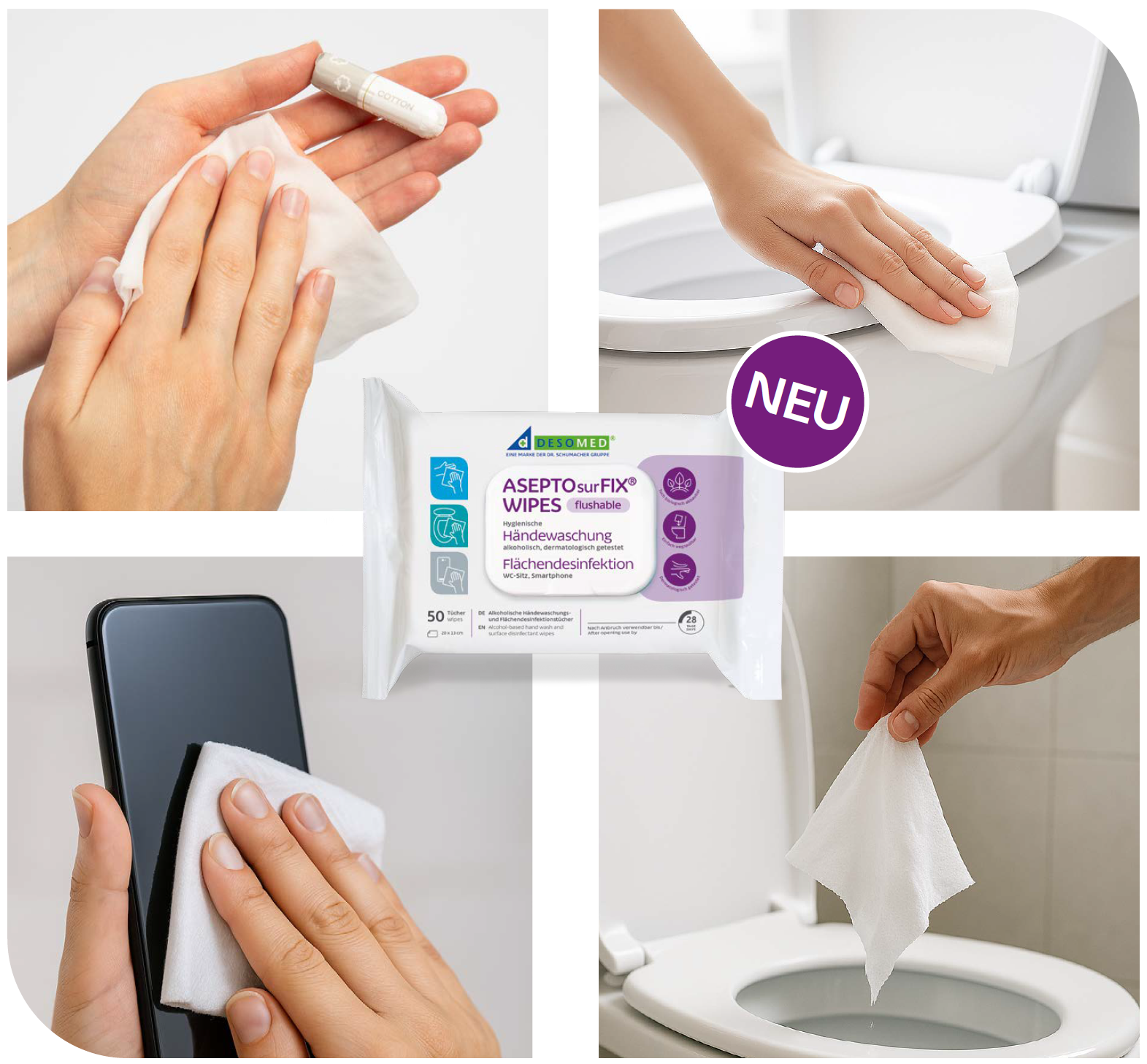 ASEPTOsurFIX WIPES sind gut geeignet für die hygienische Händewaschung sowie zur Desinfektion von Oberflächen wie Toilettensitzen oder Smartphones.